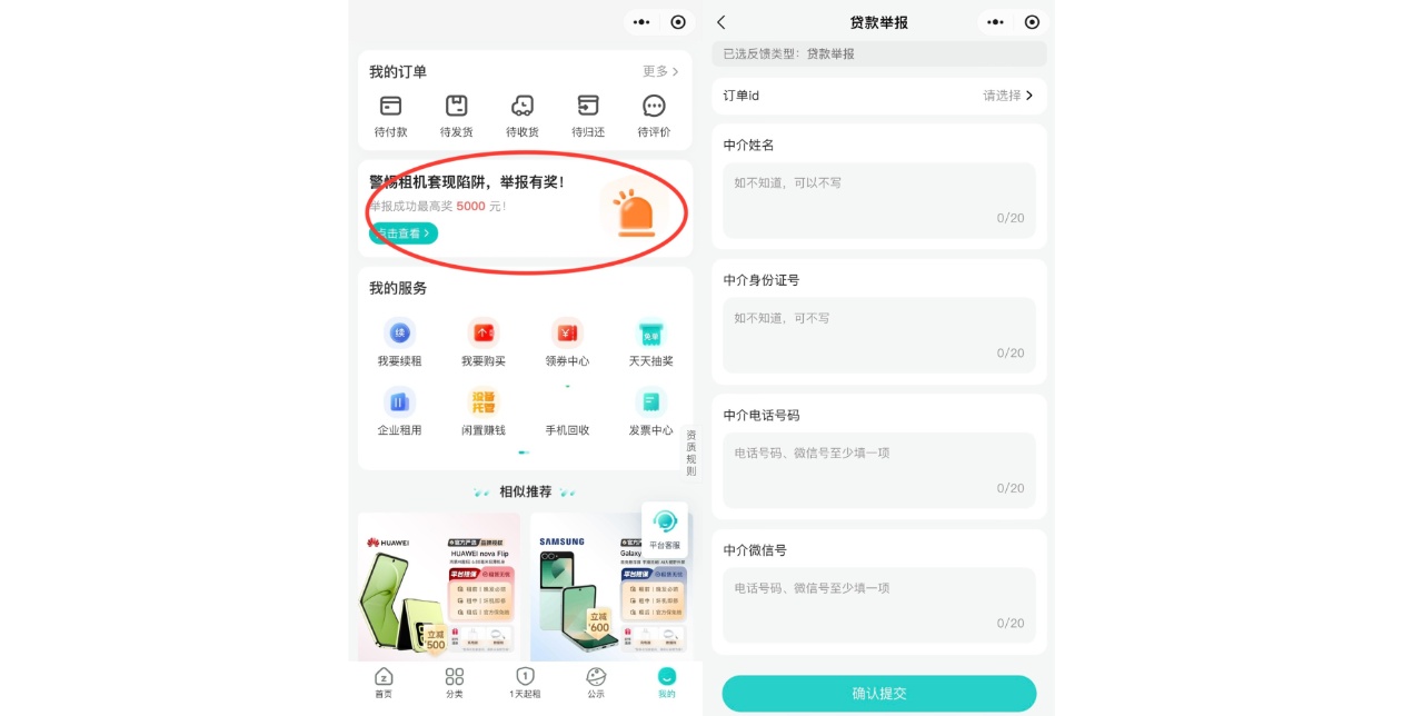 共享经济蓬勃发展,人人租作为专注于租用服务的平台,始终致力于为用户打造安全、可靠、公平的租赁环境。然而,近期有部分违规贷款中介试图通过平台实施租机后变卖套现、有偿代下单等违法违规行为,严重损害了用户的合法权益,同时也对平台的健康生态造成极大破坏。为坚决遏制此类不良现象,今年以来,人人租平台上线举报通道,并配合公安开展打击行动,目前已协助抓获2个中介团伙,行动取得初步成果。